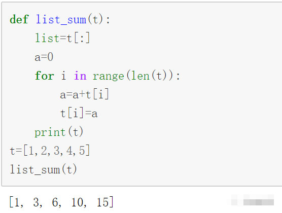例如:t=[1,2,3,4,5] 调用函数list_sum(t) 返回:[1,3,6,10,15]